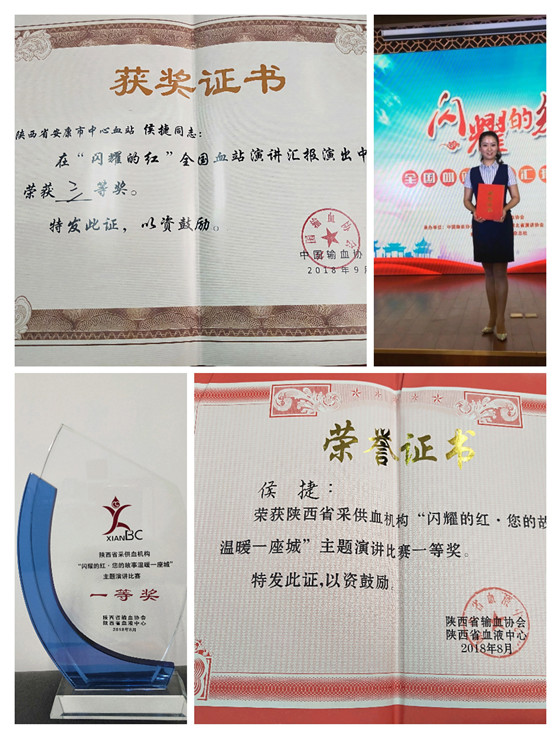我站血源管理科侯捷同志,根據(jù)自己血站崗位工作成長(zhǎng)經(jīng)歷,結(jié)合血源一線招募典型事例,充分展示安康無償獻(xiàn)血招募宣傳模式,以“成長(zhǎng)在生命年輪中的信仰”為題,代表安康市中心血站參加陜西省“閃耀的紅--您的故事溫暖一座城”血站系統(tǒng)演講比賽,以獨(dú)特的視角和演講效果奪得冠軍,并選派于9月21日代表陜西省采供血行業(yè)參加“閃耀的紅”全國(guó)血站演講比賽榮獲三等獎(jiǎng),是我站首次在全省、全國(guó)演講比賽中取得的最佳成績(jī),為我站在全國(guó)范圍內(nèi)贏得了榮譽(yù),為安康、陜西血站行業(yè)系統(tǒng)爭(zhēng)了光,在全國(guó)血液行業(yè)內(nèi)展示了我站職工昂揚(yáng)向上的精神風(fēng)貌。