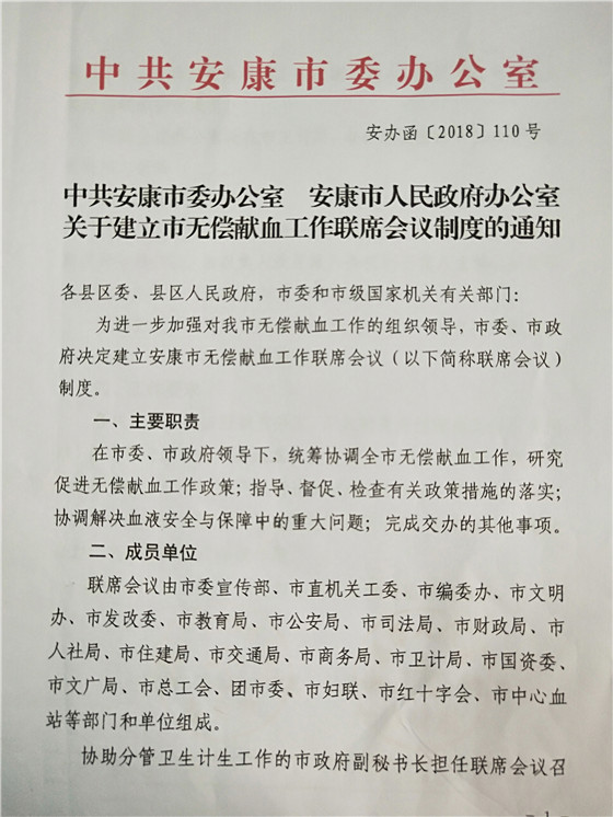 2、安康市率先在全省建立首個(gè)無償獻(xiàn)血聯(lián)系會(huì)議制度 安康無償獻(xiàn)血聯(lián)席會(huì)議制度是在安康市委、市政府領(lǐng)導(dǎo)下,由市委宣傳部等21個(gè)市級(jí)部門和單位組成,協(xié)助分管衛(wèi)生計(jì)生工作的市政府副秘書長(zhǎng)擔(dān)任聯(lián)席會(huì)議召集人。聯(lián)席會(huì)議每年召開一次全體會(huì)議,主要職責(zé)為統(tǒng)籌協(xié)調(diào)全市無償獻(xiàn)血工作,研究促進(jìn)無償獻(xiàn)血工作相關(guān)政策,指導(dǎo)、督促、檢查有關(guān)政策措施的執(zhí)行落實(shí),協(xié)調(diào)解決血液安全與保障中的重大問題。聯(lián)系會(huì)議制度的建立,標(biāo)志著我市無償獻(xiàn)血宣傳招募模式“政府主導(dǎo)、部門協(xié)作、社會(huì)參與、城鄉(xiāng)聯(lián)動(dòng)”的發(fā)展格局和長(zhǎng)效機(jī)制得到進(jìn)一步鞏固和提升。