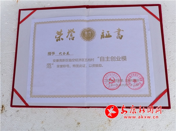 筆者從陳斌口中得知,2019年6月,代全花分別被安康高新區(qū)和五檔村黨支部、村委會授予“自強標兵”和“自主創(chuàng)業(yè)模范”榮譽稱號,去年一家成功實現(xiàn)了脫貧。?