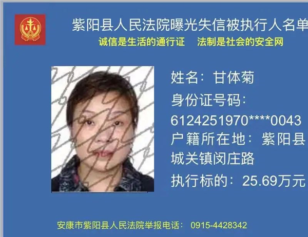被執(zhí)行人甘體菊,你因不履行(2017)陜0924民初241號民事判決書確定的義務,已被紫陽縣人民法院納入失信被執(zhí)行人名單庫依法進行信用懲戒。信用懲戒范圍包括但不限于以下措施: