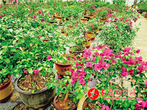 園區(qū)負(fù)責(zé)人吳斌告訴我們,到了春天,三角梅的枝條上會長出一片片嫩綠的葉子,隨著時間的變化,枝頭的葉子慢慢變紅,遠(yuǎn)遠(yuǎn)看去就像一朵朵怒放的梅花,花朵里面有花蕊,看上去就像一朵三角形的梅花,所以人們叫它三角梅。三角梅的顏色以紅、粉、黃、紫、橙、白這幾種顏色為主,而且這幾種顏色還可以細(xì)分,比如紅色可以分成重紅、玫瑰紅,黃色可以分為重黃和加州黃,顏色豐富,特別惹人喜愛。