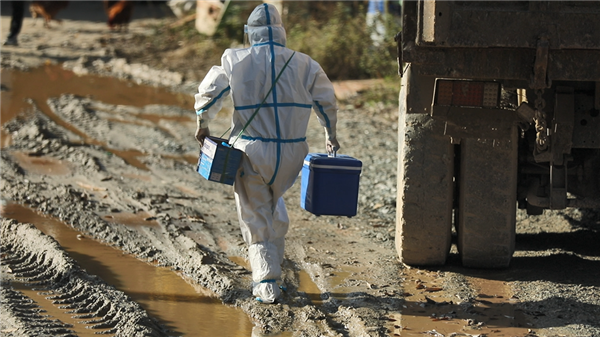 11月25日中午,忙完第一輪核酸采集,再接到流調(diào)通知單后,王康又立馬帶著他的“小伙伴”前往三里社區(qū)為居家隔離人員做核酸檢測,溝深路滑,因前幾日陰雨天氣路面濕滑,在上一處陡坡時,車輪瞬間開始側(cè)滑,但是時間緊迫只能一試再試,大概試了20余次,在村上壓路車的幫助下,又試了兩次車子終于緩緩啟動。喜悅之余他們就即刻趕往隔離群眾家中,“我們快一點,再快一點,就能讓等待的人少受一點冷”,這是“大白”們共同的心愿。