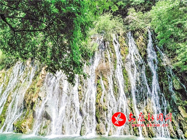 沿著木質棧道前行,沒走多遠,耳中就傳來轟隆隆的水鳴聲,循聲望去,原來在大峽谷東南面的半山腰上有一掛巨大的瀑布。透過枝葉縫隙遙看瀑布的源頭,只見清清的泉水翻過一條石堰,從高高的崖壁口義無反顧地縱身飛躍而下,本是渾然一體的百米巨幅水簾,被凹凸不平的壁巖、樹枝、水草撕裂成形狀不一的一縷縷絹綢,千絲萬縷地交織著,撕扯著。細看,又猶如由萬千珍珠串起的珠簾,懸于半山腰間。瀑布四周彌漫著流云般的淡淡煙霞,初夏的陽光照耀著瀑布,折射出炫目的七彩光芒,形成一道道彩虹。粒粒珍珠流光溢彩、熠熠生輝。壁巖上嶙峋的怪石被水經年累月地沖刷,早已失去了棱角,變得圓滑溫潤。因為潮濕的緣由,巖壁上鋪了一層厚厚的、碧綠的青苔,讓瀑布有了層次感,像極了妙手丹青繪制的巨幅山水壁畫,鮮活靈動。游人紛紛拿出手機,在此排隊拍照、攝影留念。因它位于峽谷門口,似是迎接各位游客,故得名“迎賓瀑”。想到前幾日,朋友圈有人曬出聞名古今的廬山瀑布,只剩下一縷細細的溪流,從上面無力地流瀉下來,似是隨時都有中斷的可能,哪里還有“飛流直下三千尺,疑是銀河落九天”的氣勢時,不由得對眼前的這掛瀑布更加喜愛。