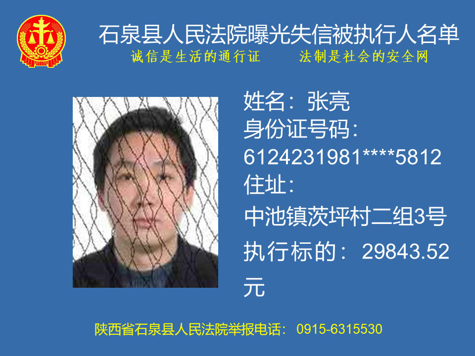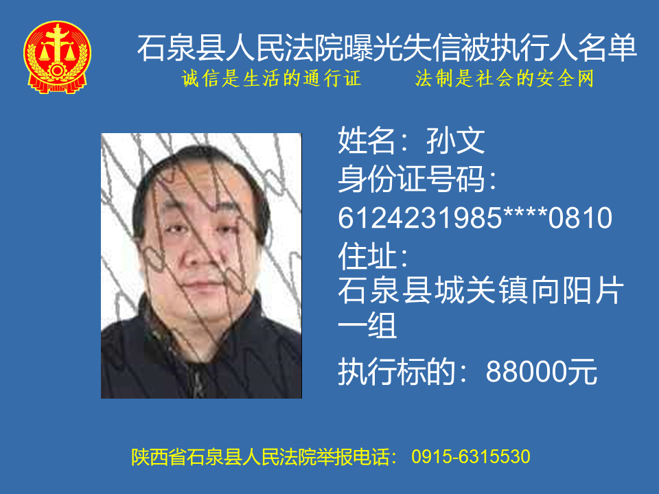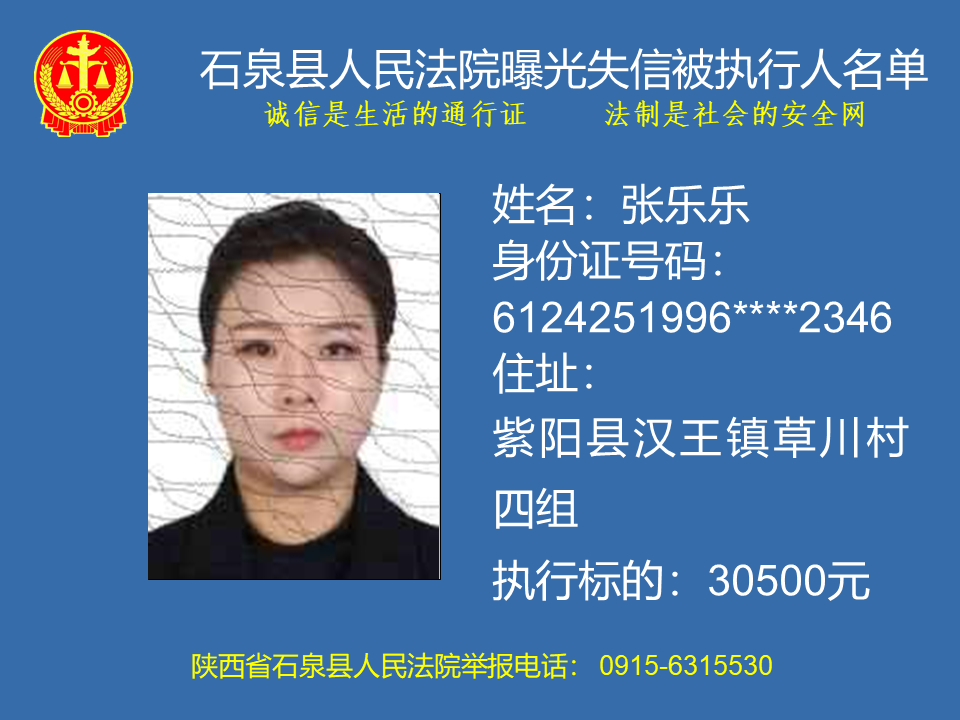 為了進(jìn)一步加大執(zhí)行力度,保障勝訴當(dāng)事人的合法權(quán)益,推進(jìn)社會(huì)誠(chéng)信體系建設(shè),依照《中華人民共和國(guó)民事訴訟法》、《最高人民法院關(guān)于公布失信被執(zhí)行人名單信息的若干規(guī)定》等法律、司法解釋的有關(guān)規(guī)定,現(xiàn)對(duì)一批已進(jìn)入執(zhí)行程序,且尚未全部履行義務(wù)的被執(zhí)行人進(jìn)行媒體曝光,歡迎廣大群眾支持石泉縣人民法院的工作,向我院提供被執(zhí)行人的財(cái)產(chǎn)線索,使生效法律文書能夠得到切實(shí)執(zhí)行,讓人民群眾切實(shí)感受到公平正義就在身邊。