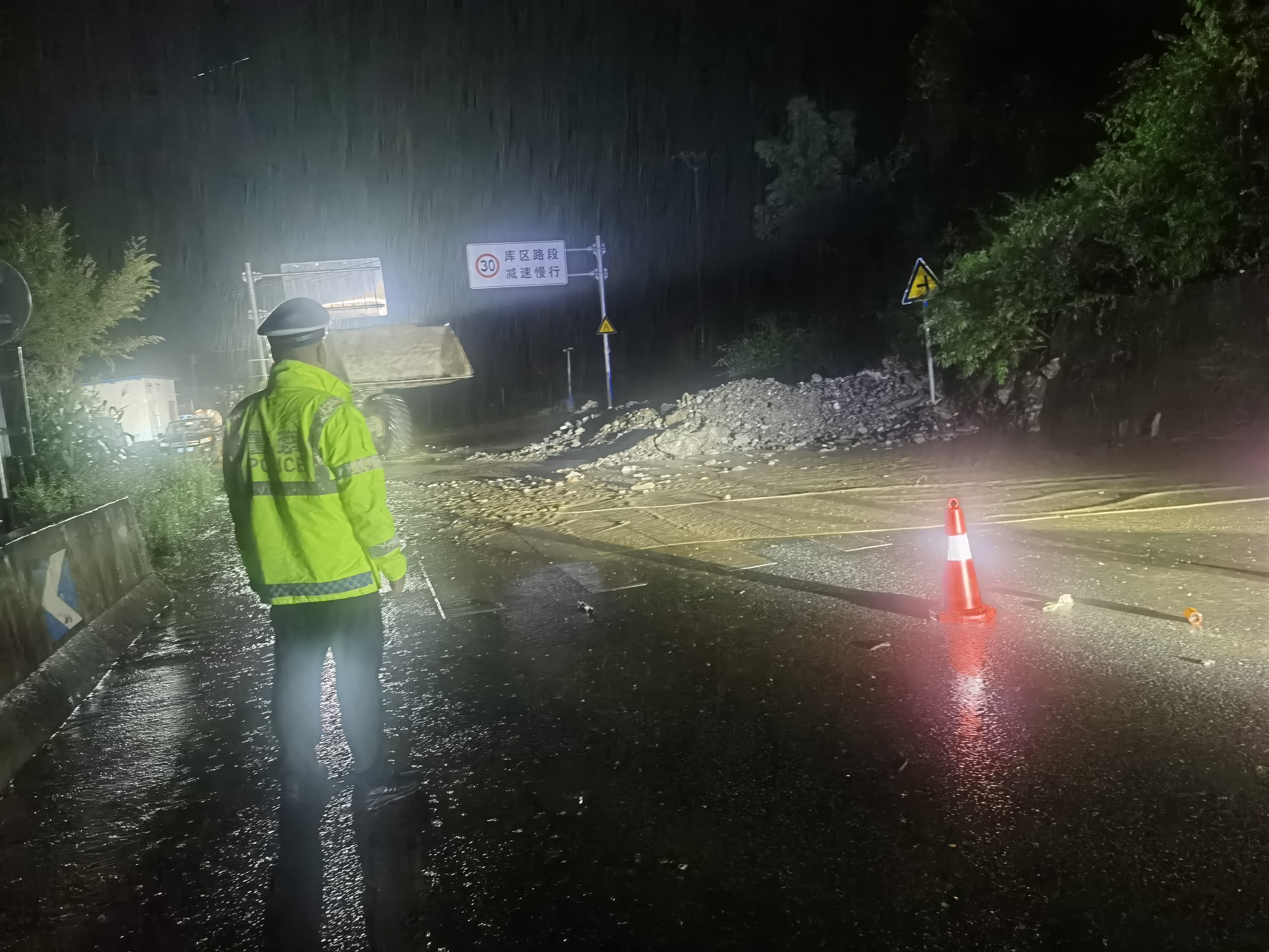旬陽(yáng)市公安交警持續(xù)堅(jiān)守防汛一線,無(wú)畏風(fēng)雨、無(wú)懼危險(xiǎn),開(kāi)展交通管控、救援救助、應(yīng)急處突、隱患排除等相關(guān)工作,全力保障人民群眾生命財(cái)產(chǎn)安全。暴雨中,交警身著熒光綠雨衣,不畏風(fēng)雨,堅(jiān)守在重要路段,對(duì)有滑坡、落石等危險(xiǎn)路段及具有安全風(fēng)險(xiǎn)的臨水臨崖路段,采取臨時(shí)禁行的管制措施,引導(dǎo)過(guò)往車(chē)輛繞行,注意行車(chē)安全,協(xié)同相關(guān)部門(mén)現(xiàn)場(chǎng)進(jìn)行清理,對(duì)不能現(xiàn)場(chǎng)處理的隱患及時(shí)上報(bào),確保排險(xiǎn)不留盲點(diǎn)、隱患不留死角。同時(shí)加強(qiáng)道路的巡邏管控,通過(guò)遠(yuǎn)端分流,引導(dǎo)車(chē)輛、行人安全有序通行,確保群眾出行安全。以雨為令,以夜為伴,逆風(fēng)而行,通宵達(dá)旦,風(fēng)雨中,一抹抹“熒光綠”在熠熠閃光。