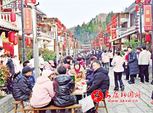 “開(kāi)席啰……”隨著一聲鑼響,充滿儀式感的省級(jí)非遺庖湯盛宴正式開(kāi)始。古色古香的店鋪門頭掛滿紅燈籠,石板鋪成的長(zhǎng)街上,賓客8人一桌圍爐而坐,道道美食依次上席,說(shuō)菜人“口吐蓮花”,菜越說(shuō)越香;酒歌高亢,越喝越暖;猜拳行令,秦巴漢子盡顯豪邁風(fēng)采;作坊小鎮(zhèn)高朋滿座,滿滿年味十里香飄。