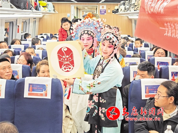 火車穿越秦巴山水間,途中,來自安康漢調(diào)二黃研究院的專業(yè)演員和地方民間漢調(diào)二黃愛好者們一同表演了國家級(jí)非物質(zhì)文化遺產(chǎn)——漢調(diào)二黃經(jīng)典戲曲演唱,并為旅客們講解漢調(diào)二黃戲曲知識(shí),與旅客們開展互動(dòng)交流,讓旅客親身體驗(yàn)漢調(diào)二黃戲服道具,感受漢調(diào)二黃的獨(dú)特藝術(shù)魅力。來自漢濱區(qū)文化館的漢濱剪紙技藝傳承人為旅客們展示講解了安康市級(jí)非物質(zhì)文化遺產(chǎn)——漢濱剪紙技藝,向參與互動(dòng)的旅客送上了親手創(chuàng)作的漢濱剪紙作品,提前送上新春祝福?;顒?dòng)中,西安鐵路公安局安康公安處的民警們和文藝工作者們一同宣傳普及了反詐知識(shí),進(jìn)一步提升旅客的安全防范意識(shí)。
