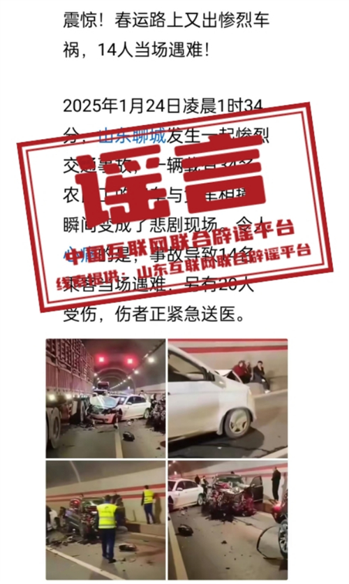 真相:近日,有網(wǎng)民在網(wǎng)絡(luò)平臺發(fā)布一則“山東聊城一隧道內(nèi)發(fā)生多車相撞”的信息,稱“現(xiàn)場多車發(fā)生嚴(yán)重碰撞,場面慘烈,群眾滯留”,引發(fā)關(guān)注。經(jīng)當(dāng)?shù)鼐胶藢?shí),山東省聊城市從未發(fā)生過類似交通事故,該信息內(nèi)容純屬虛假編造。經(jīng)查,網(wǎng)民褚某某和韓某為博取關(guān)注、吸引流量,將外省市發(fā)生交通事故的圖片視頻移花接木,稱“聊城發(fā)生交通事故”并憑空捏造傷亡人數(shù),造成不良影響。目前,二人已被公安機(jī)關(guān)依法打擊處理。(來源:山東互聯(lián)網(wǎng)聯(lián)合辟謠平臺、聊城市網(wǎng)上辟謠平臺)