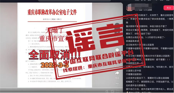 真相:近日,有網(wǎng)民在互聯(lián)網(wǎng)平臺發(fā)布消息稱“重慶市宣布,申請評審的要求取消了很多條條框框,職稱申請不看前置職稱,全日制本科十年直接認(rèn)定副高,不需要中級職稱”,引發(fā)關(guān)注。經(jīng)核實,網(wǎng)傳信息系謠言。職稱評審均需逐級晉升,取得上一級職稱并滿足相應(yīng)學(xué)歷資歷條件后方可晉升高一級職稱。目前重慶市除特殊人才、博士后等3個針對特定對象的職稱申報綠色通道外,正常申報通道均需逐級晉升。網(wǎng)傳文件是網(wǎng)民通過P圖軟件編輯而成,試圖吸引不明真相的群眾咨詢,借機(jī)推銷職稱代辦服務(wù),收取高額費用。目前,謠言線索已轉(zhuǎn)交公安機(jī)關(guān)進(jìn)一步調(diào)查處置。(來源:“重慶辟謠”微信公眾號)