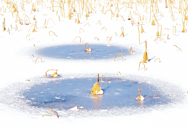 功夫在詩外,藝術皆相通。在西安美院期間,我學習過美術史論,對傳統(tǒng)美學和西方美學有了系統(tǒng)學習和認知,尤其鐘情“以空寫實”的留白意境,“鳥宿池邊樹,僧敲月下門”空靈意境讓我神往。我把美術理論運用到攝影實踐。在拍攝荷塘時,我常借助湖面鏡面反射構建對稱構圖,讓殘陽余暉與湖面蓮藕剪影在虛實間互動;俯拍蓮蓬剪影時,輪廓線條在晨昏光暈中的若隱若現(xiàn),恰似水墨畫的筆斷意連,在快節(jié)奏的現(xiàn)代社會中,我渴望通過鏡頭喚醒觀者對靜謐與永恒的感知。