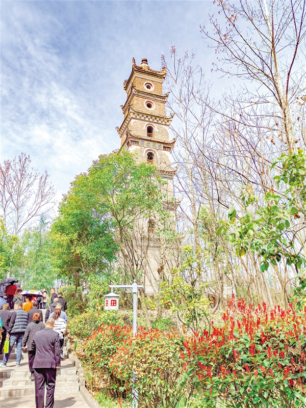 這時(shí),塔側(cè)傳來(lái)歡快的鑼鼓聲,循聲望去,是一段十幾米的孝義文化長(zhǎng)廊,一組男女或站或坐敲打著響器,使奠安塔不再寂寞。廊道的另一頭連接著奠安公園,環(huán)形觀景步道上擠滿(mǎn)了游覽的人。春分時(shí)節(jié),杏花正在萌發(fā),桃花含苞待放,倒是紅葉李花開(kāi)正艷,細(xì)小如甲的花瓣布滿(mǎn)枝頭,零落軟泥上,雪白一片,仿佛成了李花的世界。舉目四望,花草清新,小學(xué)生在撿拾垃圾,胸前的紅領(lǐng)巾在陽(yáng)光的照射下熠熠生輝,與周遭綠植映襯,絢爛了滿(mǎn)園春色。