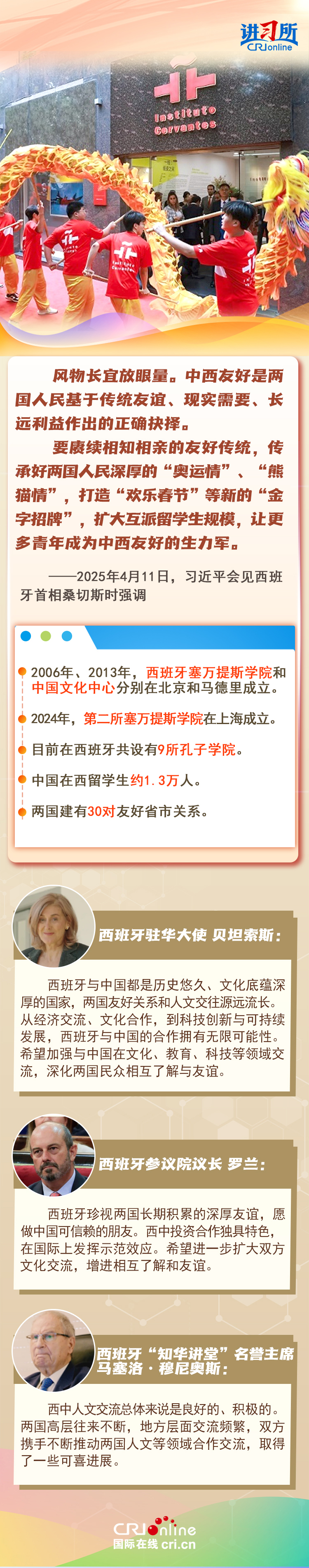 今年是中西全面戰(zhàn)略伙伴關(guān)系建立20周年,也是中歐建交50周年。多年來,中西兩國領(lǐng)導人保持密切互動,秉持互尊互信、互利共贏精神,兩國在深化貿(mào)易、投資、科技創(chuàng)新、綠色能源等領(lǐng)域取得豐富合作成果,雙邊關(guān)系走在中國同歐洲國家關(guān)系前列。在西班牙人士眼中,良好的對華關(guān)系對西班牙、歐洲和世界具有重要意義,將會為兩國人民帶來更多實實在在的福祉,也將共同創(chuàng)造更美好的未來。
