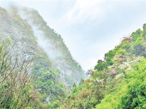 推開房門,晨霧尚未散盡,細(xì)雨斜斜地織著。老人們常說“有雨山戴帽,無雨半山腰”,這話在此時(shí)格外應(yīng)景——裊裊云霧沉甸甸地壓住遠(yuǎn)處的峰頂,像給每座山頭都戴了一頂灰絨帽子,讓群山失去了往日的險(xiǎn)峻,只留下青灰色的輪廓,恍若一幅優(yōu)美的寫意水墨畫。等到午后雨勢稍小,云霧退到半山腰,卻始終戀著大山不肯消散。隨著一陣陣微風(fēng)拂起,那些云霧像被吹落的玉帶,在墨綠的樹林間織出半透明的簾幕。