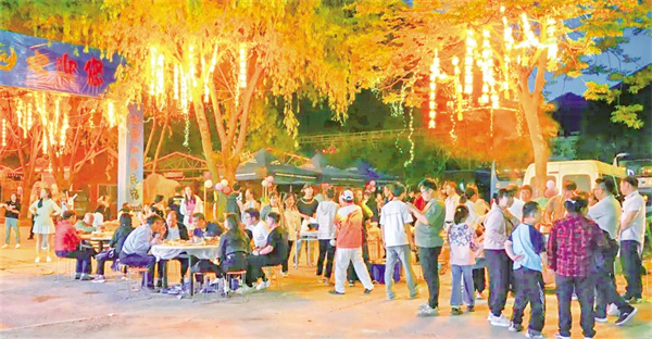 活動現(xiàn)場,本土樂隊、游客與特邀嘉賓輪番登臺,民謠、搖滾、電子樂交織回蕩。游客們圍著篝火載歌載舞,火光映紅張張笑臉?,F(xiàn)場設置的文創(chuàng)產品和小龍蝦、燒烤等特色美食攤位更是滿足了游客的多重體驗。
