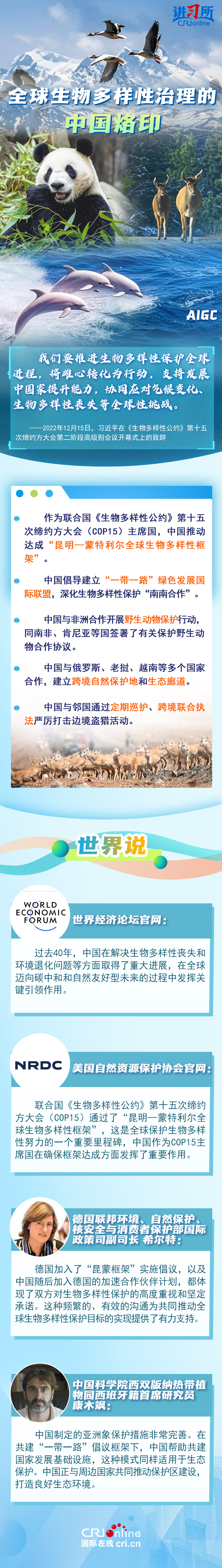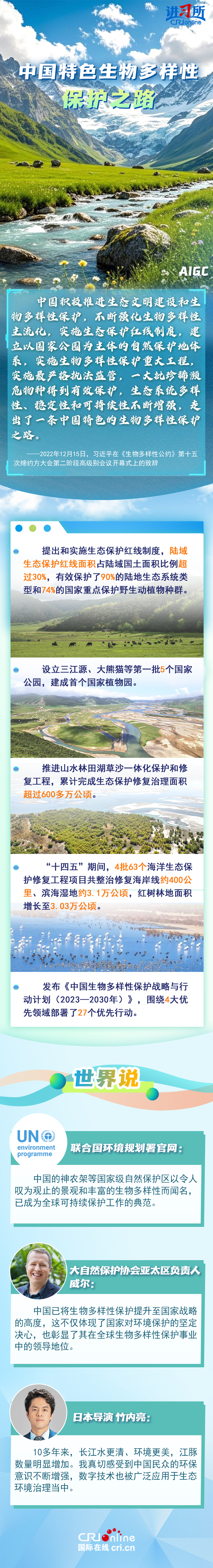 “心往一處想、勁往一處使,共建地球生命共同體。”作為最早簽署、批準(zhǔn)《生物多樣性公約》的締約方之一,生物多樣性保護(hù)已經(jīng)上升為中國的國家發(fā)展戰(zhàn)略。國際人士表示,中國的一系列舉措體現(xiàn)出對生態(tài)環(huán)境保護(hù)的堅(jiān)定決心,同時,中國依托共建“一帶一路”倡議等國際合作機(jī)制,為推動全球生物多樣性保護(hù)提供了有力支持,在邁向自然友好型未來的過程中發(fā)揮關(guān)鍵的引領(lǐng)作用。