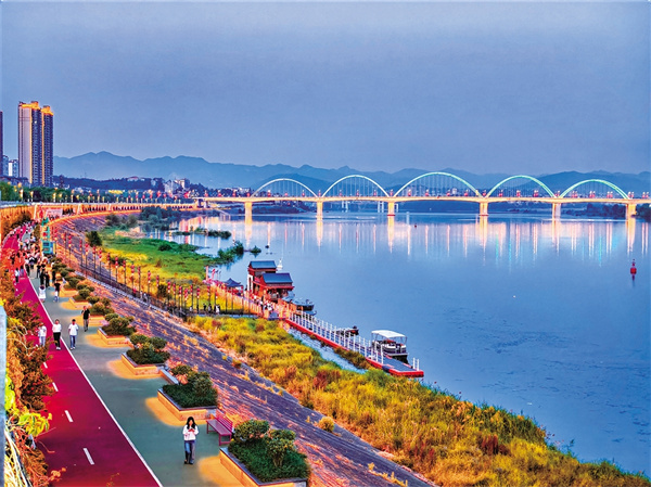 眼前的漢江是安康人的母親河,它發(fā)源于漢中市寧強(qiáng)縣,一路歡聲笑語(yǔ),流過安康。旬陽(yáng)電站建成蓄水后,這里變成安康湖,江面寬闊,碧波蕩漾。一艘漢江游船順流東下,幾艘快艇逆行沖浪。前方不遠(yuǎn)處那座彩虹橋下,一群孩子嘰嘰喳喳,正在那里學(xué)習(xí)游艇試水。漢江安康城區(qū)段過去只有一座大橋,后來先后修建了二橋、三橋、四橋。下游孩子們戲水的地方,就是東壩漢江大橋,也稱“四橋”。這座橋建得很漂亮,尤其是到了晚上,橋上的彩燈能夠變換出多種顏色,成為安康的“網(wǎng)紅橋”。