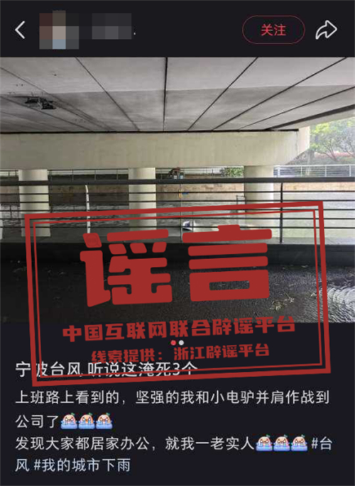 真相:7月30日10時許,某短視頻平臺網民湯某(女,63歲,寧波鄞州人)發(fā)布一段汽車被水沖走的視頻,并標注“寧波海曙區(qū)龍觀大路村,臺風造成情況”。經核查,海曙龍觀大路村并未出現(xiàn)視頻中情況。目前公安機關已對湯某依法予以批評教育,該視頻現(xiàn)已刪除。(來源:“上海網絡辟謠”微信公眾號、“寧波發(fā)布”微信公眾號)