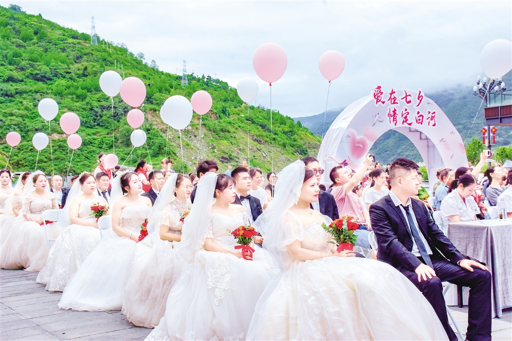 ?8月29日上午,“愛在七夕·情定白河”2025年白河縣新時代文明實踐集體婚禮主題活動在河街寶石文化廣場浪漫啟幕。來自各行各業(yè)的8對“珍珠婚”夫婦、8對新人齊聚一堂,通過分享婚姻保鮮秘訣、頒發(fā)結(jié)婚證、簽訂承諾書、開展婚姻家庭輔導(dǎo)等簡約而莊重的儀式,在各界代表和親朋好友的見證祝福下,開啟幸福婚姻新篇章,用實際行動踐行婚事新辦、喜事儉辦的文明新風(fēng)尚。(紀(jì)道婭 攝)