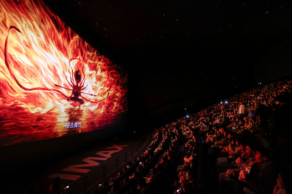 2025年2月25日,觀眾在貴陽越界影城IMAX影廳內(nèi)觀看電影《哪吒之魔童鬧?!?。動畫電影《哪吒之魔童鬧海》自1月29日上映后票房一路高歌猛進(jìn),僅用8天便登頂中國影史票房榜,隨后成為全球單一市場票房冠軍、全球動畫電影票房冠軍。2025年以來,國家電影局等相繼啟動“跟著電影品美食”“跟著電影去旅游”“中國電影消費年”活動,充分發(fā)揮電影對提振消費的積極作用;各地文旅部門等通過發(fā)布觀影消費券、舉辦主題活動等形式推動影旅融合,發(fā)展票根經(jīng)濟(jì)。