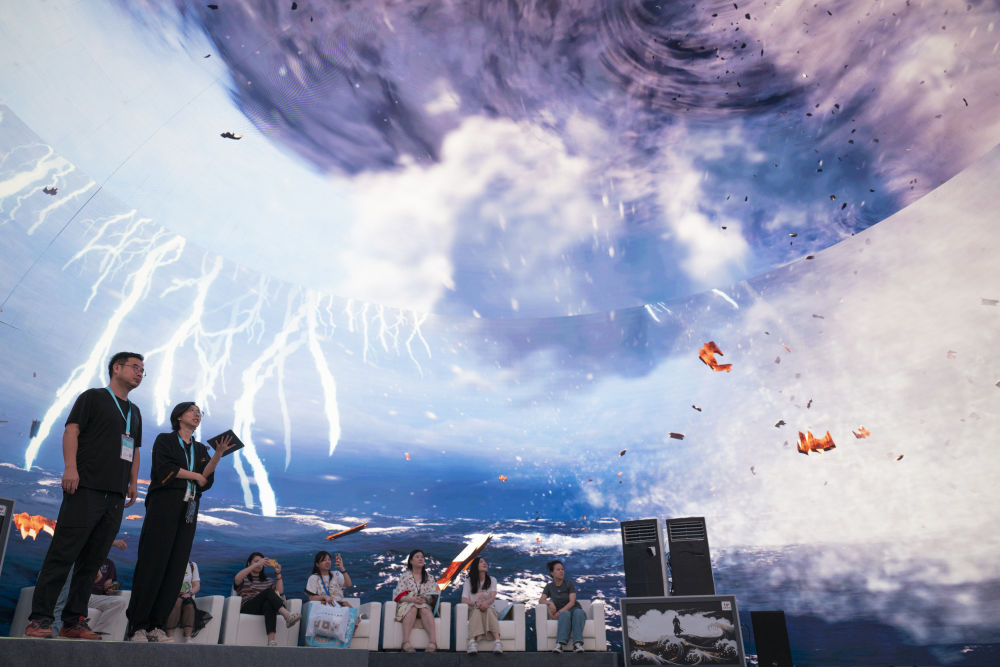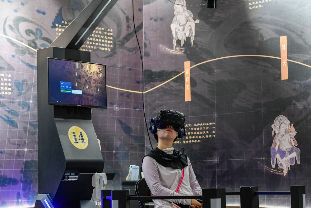 2024年7月22日,游客在“尋境敦煌——數(shù)字敦煌沉浸展”借助VR設(shè)備沉浸式游覽莫高窟第285窟虛擬場景?!皩ぞ扯鼗汀獢?shù)字敦煌沉浸展”綜合運用VR虛擬現(xiàn)實、三維建模、游戲引擎的物理渲染和全局動態(tài)光照等新技術(shù),高精度立體還原了莫高窟第285窟。游客戴上VR眼鏡,不僅可以零距離觀賞壁畫、360度自由探索洞窟細(xì)節(jié),還能“飛升”到窟頂,身臨其境參與壁畫故事情節(jié),沉浸式感受敦煌文化的魅力。