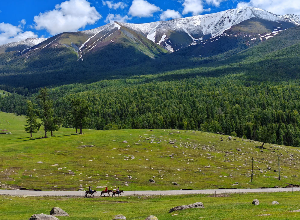 2024年6月4日,游客在新疆阿勒泰地區(qū)哈巴河縣騎馬游玩。電視劇《我的阿勒泰》播出后,新疆阿勒泰地區(qū)迎來客流高峰,“張鳳俠的小賣部”“巴太樹”“彩虹布拉克”等劇中地點成為熱門旅游打卡地。這場“邊城”與“熱劇”雙向奔赴的文旅盛宴,為當(dāng)?shù)亟?jīng)濟(jì)發(fā)展帶來新的增長點。2024年5月,當(dāng)?shù)亟哟慰?15.03萬人次,同比增長60.81%;實現(xiàn)旅游收入36.53億元,同比增長88.25%。