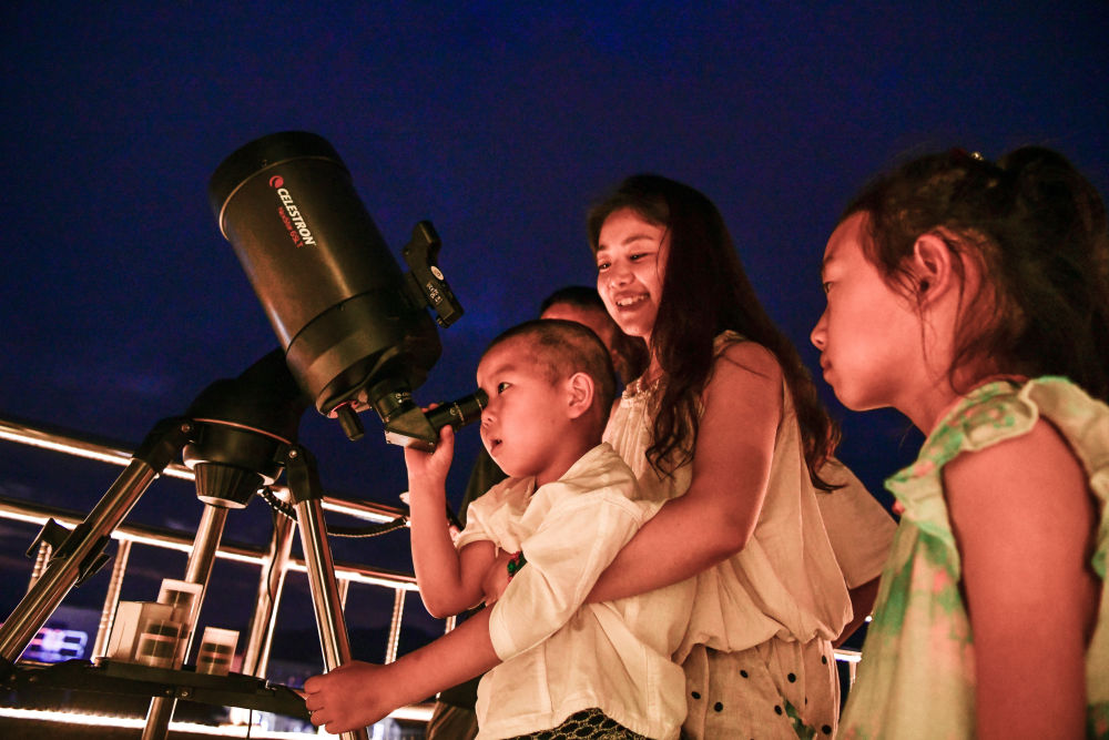 2025年7月9日,游客在貴州省平塘縣克度“天文小鎮(zhèn)”通過望遠(yuǎn)鏡觀測星空。近年來,隨著旅游設(shè)施逐漸完善,距離“中國天眼”僅8公里的克度“天文小鎮(zhèn)”通過“科普+文旅”發(fā)展模式,帶動村民就業(yè)創(chuàng)業(yè)、增收致富。2025年1月至6月,“中國天眼”景區(qū)共接待游客約38萬人次,總收入2496萬余元。