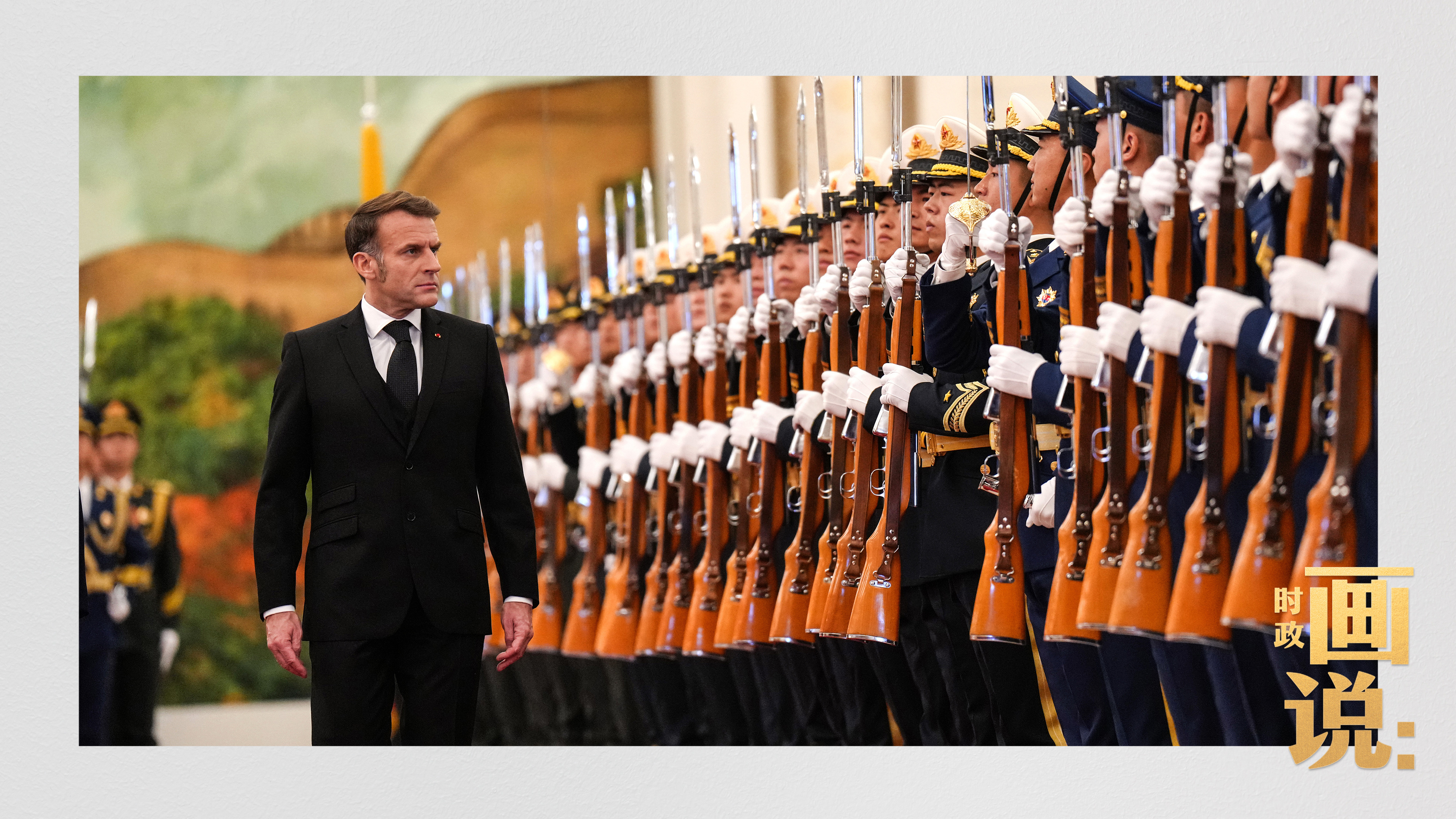 △馬克龍在習(xí)近平陪同下檢閱中國人民解放軍儀仗隊并觀看分列式