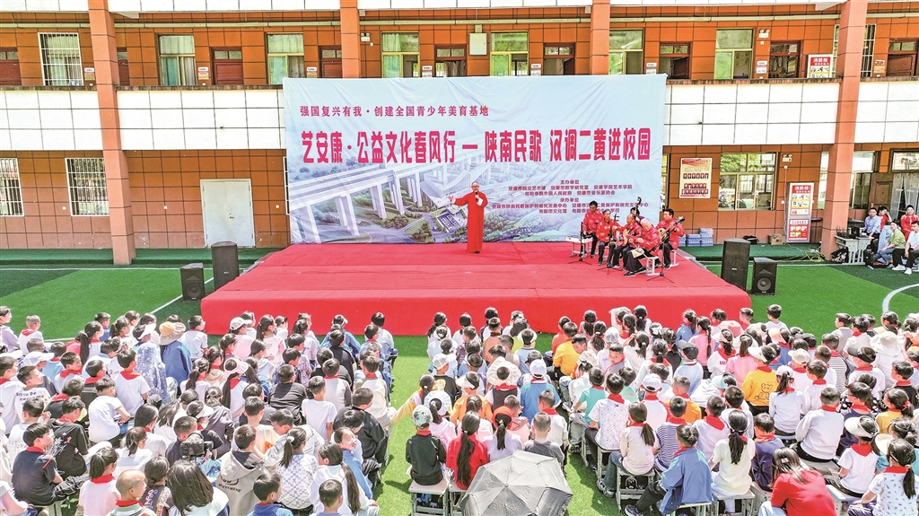 展演現(xiàn)場,紫陽小學學生帶來的民歌聯(lián)唱《童聲唱紫陽》贏得滿堂喝彩。孩子們用清亮的嗓音演繹《開山歌》《三月三上茶山》《螃蟹歌》等經典陜南民歌,悠揚婉轉的旋律中透著童真童趣,將地域文化的獨特韻味展現(xiàn)得淋漓盡致?!斑@首歌是奶奶教我唱的,現(xiàn)在我在學校社團里學會了更多唱法?!敝鞒獙W生鄧可唯說,通過美育課程,她不僅學會了唱歌,還了解了民歌背后的民俗故事。