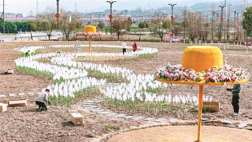 不遠(yuǎn)處的迎賓公園里,另一組工作人員正沿著步道和綠化帶安裝布置蘆葦燈帶。一根根蘆葦狀的燈桿錯(cuò)落豎立,待夜幕降臨時(shí),將勾勒出公園蜿蜒的輪廓,營造出寧靜溫馨的夜間景致。
