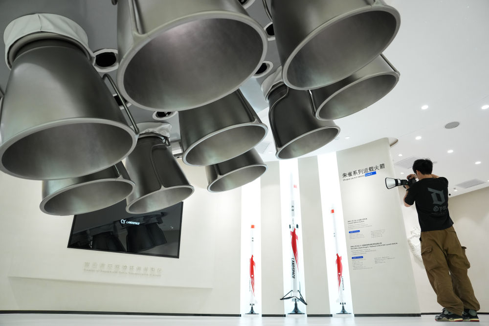 強(qiáng)化產(chǎn)業(yè)圈聯(lián)動發(fā)展,是北京持續(xù)提升科技成果區(qū)域內(nèi)轉(zhuǎn)化效率和比重的有效舉措。以商業(yè)航天產(chǎn)業(yè)為例,目前,扎根北京的商業(yè)航天百強(qiáng)企業(yè)、上市企業(yè)和獨(dú)角獸企業(yè)約占全國半壁江山。產(chǎn)業(yè)鏈覆蓋運(yùn)載火箭、衛(wèi)星制造、地面站及終端設(shè)備、衛(wèi)星應(yīng)用服務(wù)全領(lǐng)域。這是2025年6月18日在北京經(jīng)濟(jì)技術(shù)開發(fā)區(qū)藍(lán)箭航天空間科技股份有限公司拍攝的朱雀系列運(yùn)載火箭模型。
