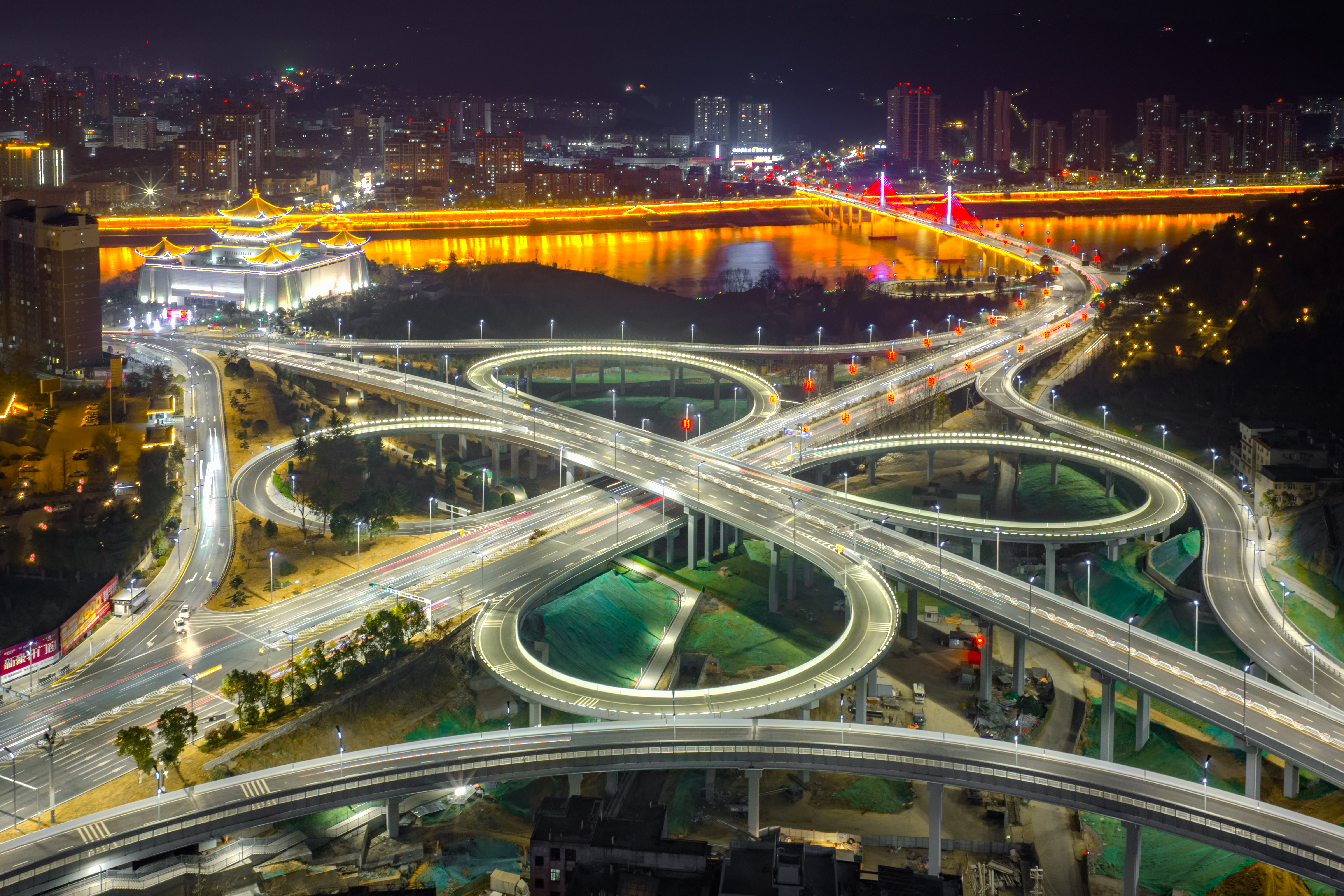 夜晚的七里溝立交,流光溢彩,匝道如銀鏈交織,與漢江粼粼波光彼此輝映,共同勾勒出一幅流動(dòng)的城市發(fā)展畫(huà)卷。唐軍 攝