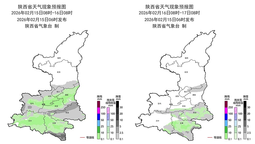 雨雪過程期間陜北南部、關(guān)中北部、秦巴山區(qū)小到中雪或雨夾雪(0.1~5毫米),關(guān)中南部、陜南為雨夾雪或小雨(0.1~5毫米),陜南南部局地有中雨(10~15毫米);雨雪落區(qū)2月15日在陜北南部、關(guān)中、陜南,16 日(除夕)至17日(初一)在陜南。受雨雪影響,2月15日夜間至16日(除夕)清晨全省大部能見度較低,秦巴山區(qū)局地有大霧。2月14日至15日和21日(初五)全省大部有4~5級(5.5~10.7米/秒)偏北風(fēng),陣風(fēng)6~7級(10.8~17.1米/秒),其中2月21日(初五)中北部部分地方伴有揚沙或浮塵。兩次降溫均屬于中等強度,日平均氣溫全省大部下降4~6℃,陜北北部、秦嶺山區(qū)下降6~8℃。
