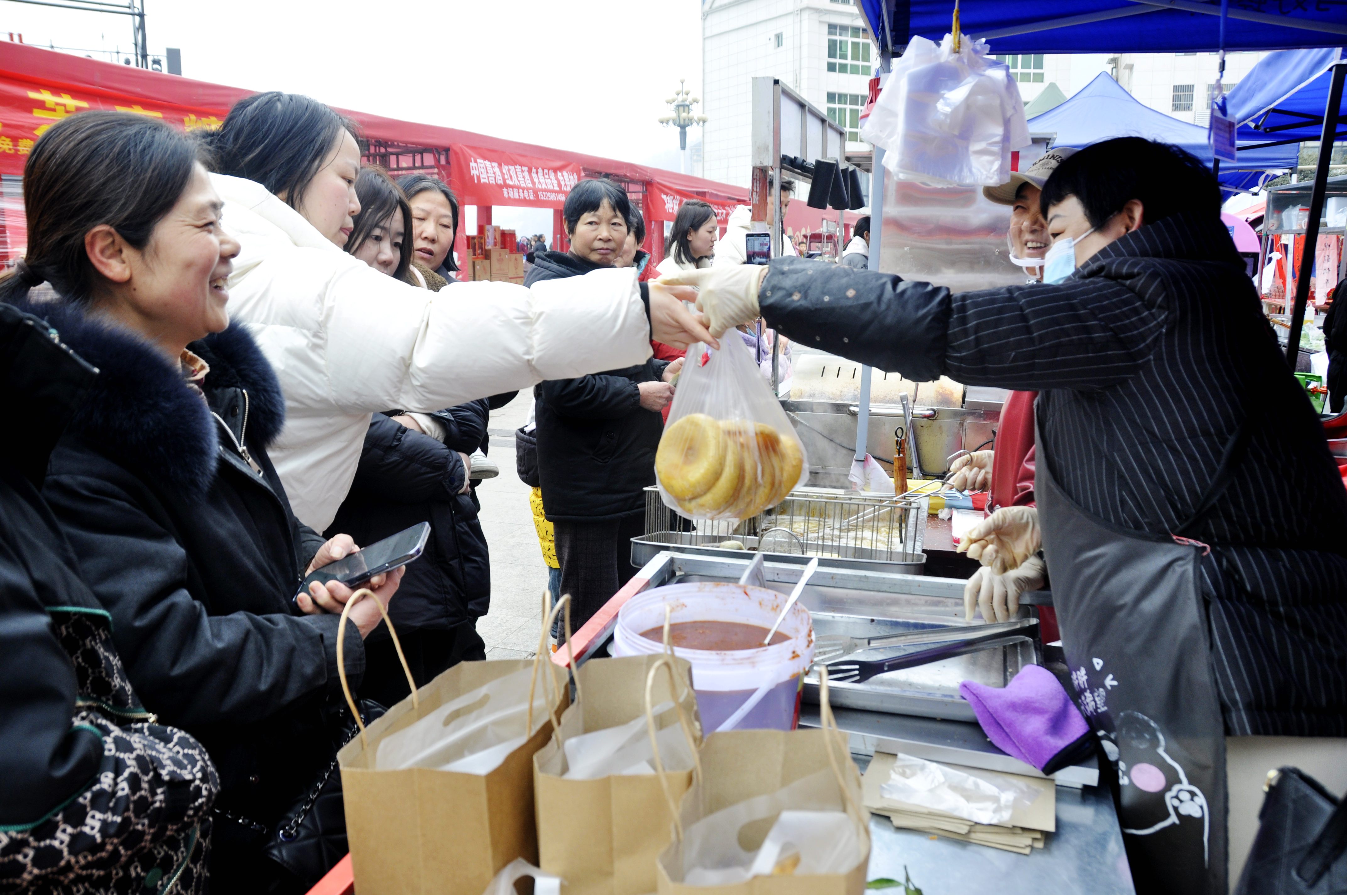 節(jié)日里的紫陽(yáng)縣城一派繁榮祥和,圖為市民在頗有名氣的煥古高老二的油糍攤前排隊(duì)購(gòu)買。彭召伍 攝