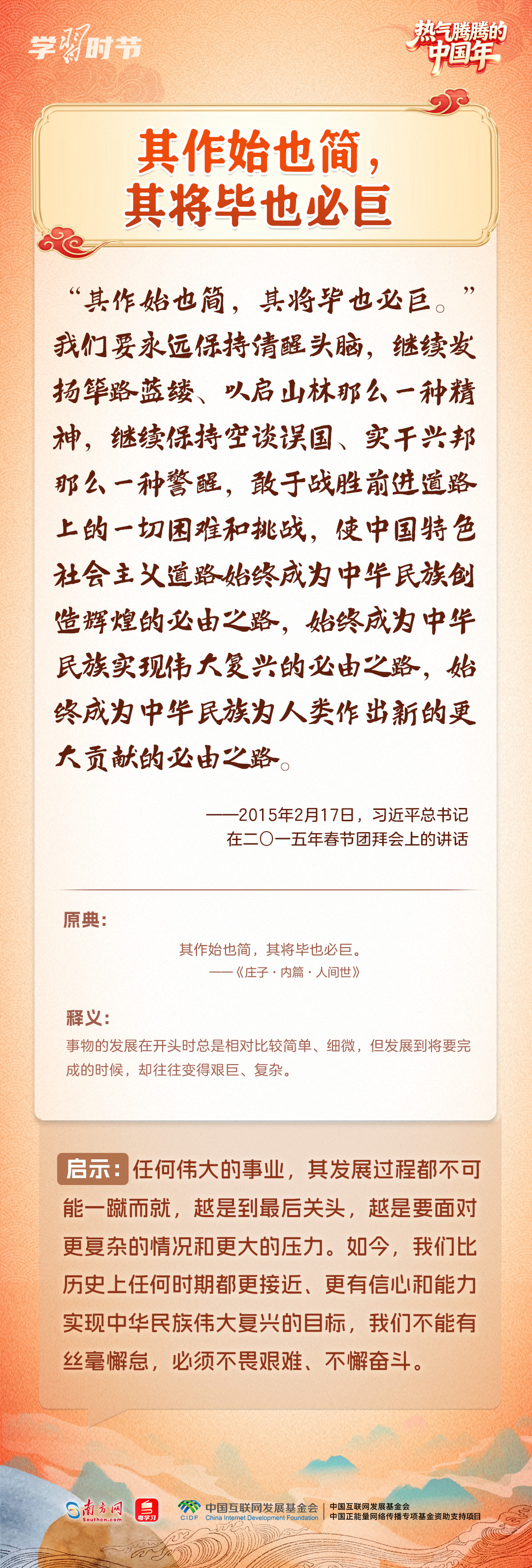 “在中國(guó)式現(xiàn)代化新征程上策馬揚(yáng)鞭、勇往直前,共同開(kāi)創(chuàng)更加美好的未來(lái)。”2月14日,在二〇二六年春節(jié)團(tuán)拜會(huì)上,習(xí)近平總書(shū)記的重要講話振奮人心。黨的十八大以來(lái),習(xí)近平總書(shū)記多次在春節(jié)團(tuán)拜會(huì)上發(fā)表重要講話,回望舊歲、展望新年,向大家致以美好的新春祝福。在講話中,習(xí)近平總書(shū)記常常巧妙引用古典名句砥礪人心,指引我們腳踏實(shí)地、銳意前行,提醒我們珍視親情、涵養(yǎng)孝道。一起來(lái)學(xué)習(xí)感悟。