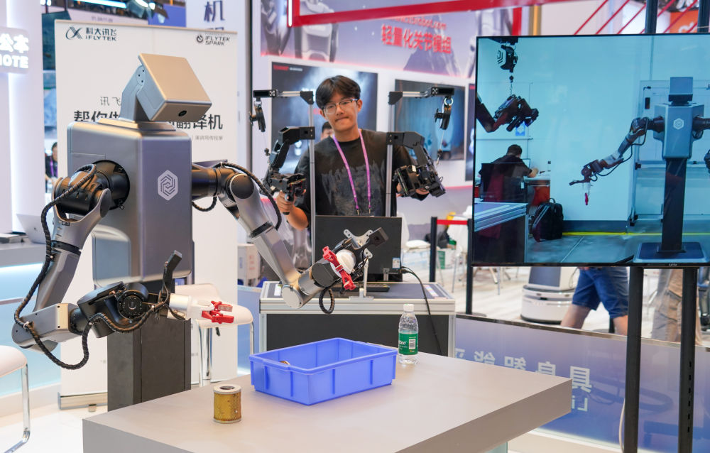 2025年10月16日,工作人員在第138屆廣交會(huì)科大訊飛展臺(tái)操作機(jī)器人拿取物品。新華社記者 肖恩楠 攝