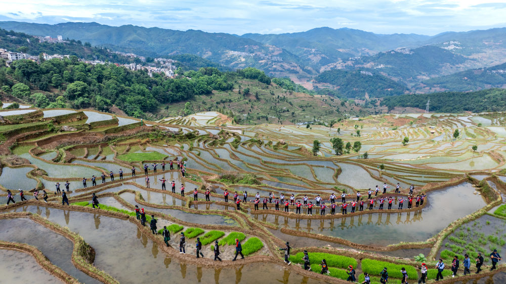 2025年5月2日,在云南省紅河縣甲寅村“開(kāi)秧門(mén)”儀式上,村民身著民族服飾,沿著田埂踏歌而行(無(wú)人機(jī)照片)。新華社記者 胡超 攝