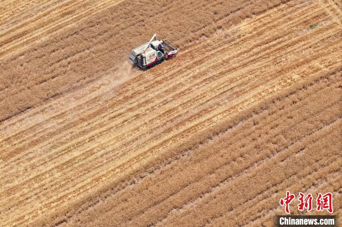 資料圖:江蘇南京,工作人員駕駛農(nóng)機(jī)在江北一處田間收割小麥。(無(wú)人機(jī)照片)中新社記者 泱波 攝
