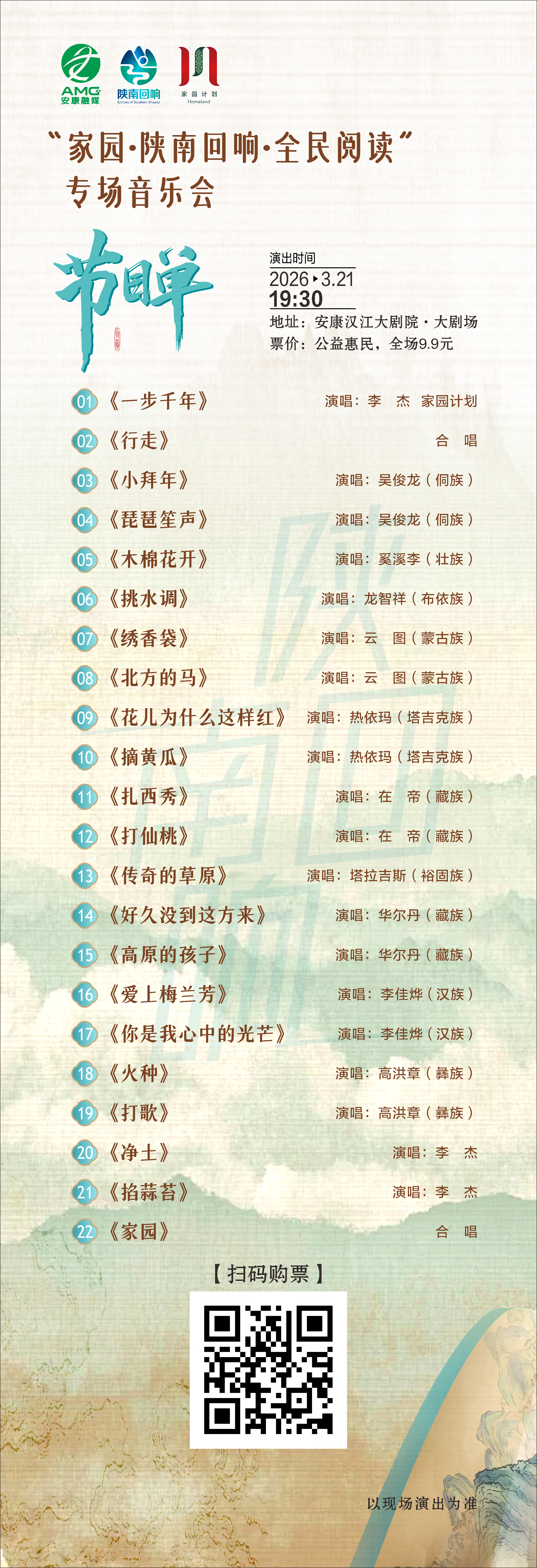 音樂(lè)是流動(dòng)的家園,歌聲是永恒的閱讀。3月21日周六夜晚,讓我們相約漢江大劇院,聽(tīng)各族天籟與陜南回響的交融,在文字與旋律的交織中,聽(tīng)見(jiàn)安康,讀懂家園。