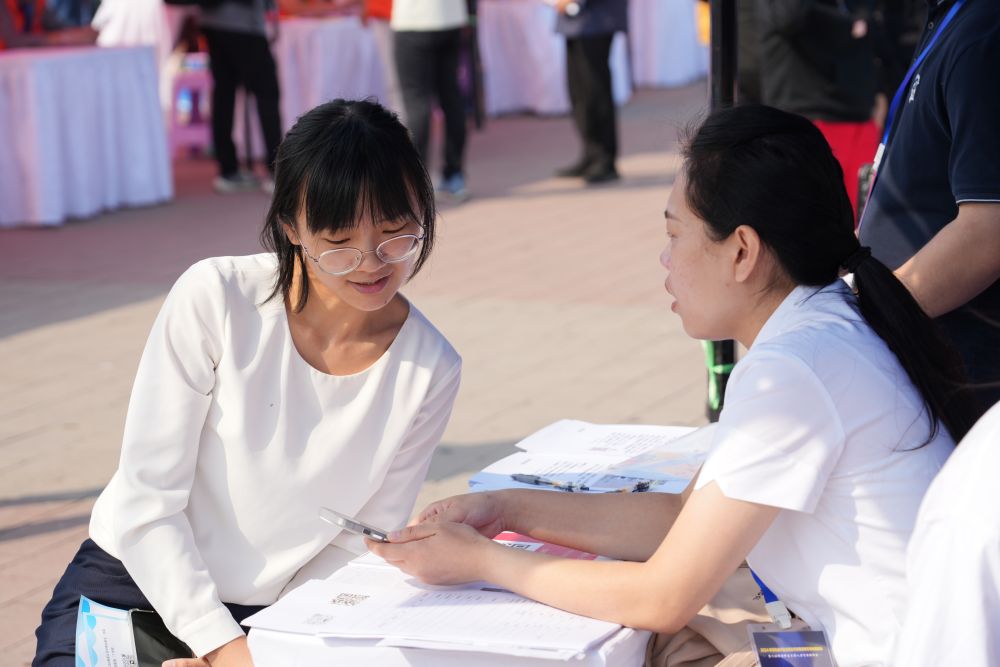 2024年9月25日,求職者(左)在招聘會(huì)現(xiàn)場與招聘單位工作人員交流。當(dāng)日,雄安新區(qū)舉辦2024年河北省畢業(yè)生就業(yè)市場雄安新區(qū)專場招聘會(huì)暨河北雄安新區(qū)大型人力資源招聘會(huì)。招聘會(huì)以“穩(wěn)崗就業(yè) 聚才發(fā)展”為主題,邀請京津冀地區(qū)共157家企業(yè)線下參會(huì),提供就業(yè)崗位4783個(gè)。