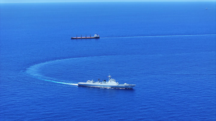 中國海軍第46批護(hù)航編隊(duì)焦作艦(下)護(hù)送貨船至解護(hù)點(diǎn)后與之分航(2024年5月7日攝)。新華社發(fā)(張大禹 攝)