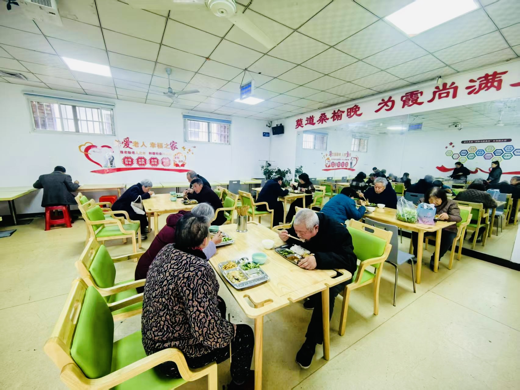 “開飯咯!”隨著廚師一聲洪亮的吆喝,社區(qū)里的老人不約而同地起身,邁著慢悠悠的步子走向餐廳。不一會兒,一道道家常菜肴就端上了桌:清炒油麥菜脆嫩爽口,酸辣土豆絲開胃解膩,豬肉燉粉條燉得軟爛,老人不用費(fèi)牙就能咬動,再配上一碗熱氣騰騰的排骨湯,三菜一湯,葷素搭配,既可口又有營養(yǎng)。