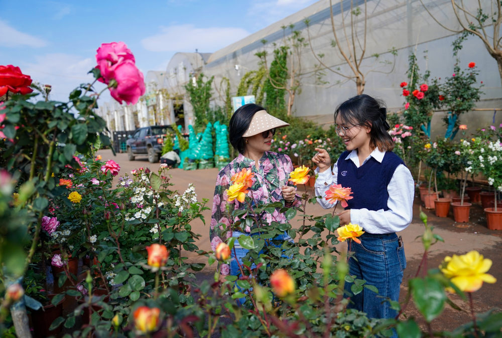 2025年4月11日,越南花商阮翠云(左)與翻譯李青歌在云南昆明斗南一花卉基地內(nèi)查看鮮花品質(zhì)。2018年,阮翠云開始在越南銷售云南花卉,讓七彩“云花”成為眾多越南家庭的“??汀薄=柚咝У碾娚唐脚_和快捷的物流網(wǎng)絡(luò),鮮花從云南花田到河內(nèi)貨架實現(xiàn)了“次日達”。