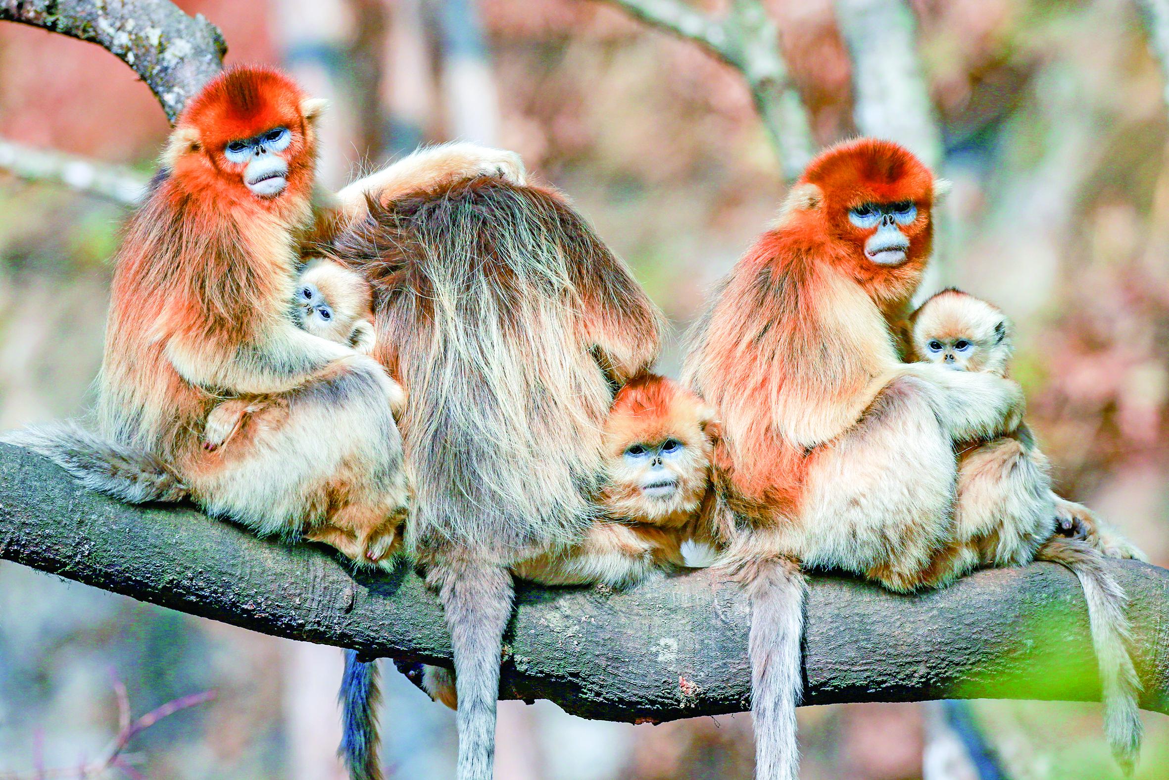 川金絲猴喜群棲生活,是典型的群居動(dòng)物,一個(gè)猴群通常由幾十只甚至幾百只猴子組成。而每個(gè)大的集群按家族性的小集群為活動(dòng)單位,每個(gè)小集群由1只強(qiáng)健的成年雄性個(gè)體為首領(lǐng)搭配3-5只雌猴及3歲以下的幼猴組成。一般情況下,川金絲猴猴群由兩類單元組成,一類是以一雄多雌的小家庭為單位的多家庭單元,另一類是由單身雄性個(gè)體組成的全雄單元。其社群中存在等級(jí)序列,在一雄多雌單元內(nèi)主雄地位最高,成年雌性次之,最低的為亞成年雌性和青少年猴,但川金絲猴的等級(jí)并非嚴(yán)格。族群內(nèi)部和睦友善,個(gè)體間互相理毛、依偎相伴,極少發(fā)生沖突。川金絲猴的社會(huì)主要是以母系一雄多雌為基本社會(huì)單元的重層結(jié)構(gòu)。家庭成員之間相互呵護(hù)關(guān)照,一起覓食休息,家庭中的成年雄猴承擔(dān)著保護(hù)家庭的責(zé)任,時(shí)刻保持著高度警覺(jué),準(zhǔn)備驅(qū)逐來(lái)犯之?dāng)?;成年的雌猴母性很?qiáng),對(duì)幼猴都十分愛(ài)憐,特別對(duì)新出生小猴的照顧是無(wú)微不至的,雌猴們互相幫助,讓幼仔們?cè)诔錾竽軌蚩焖侔l(fā)育。它們依靠多樣叫聲、肢體動(dòng)作完成交流,傳遞警戒、親昵等各類行為信號(hào)。