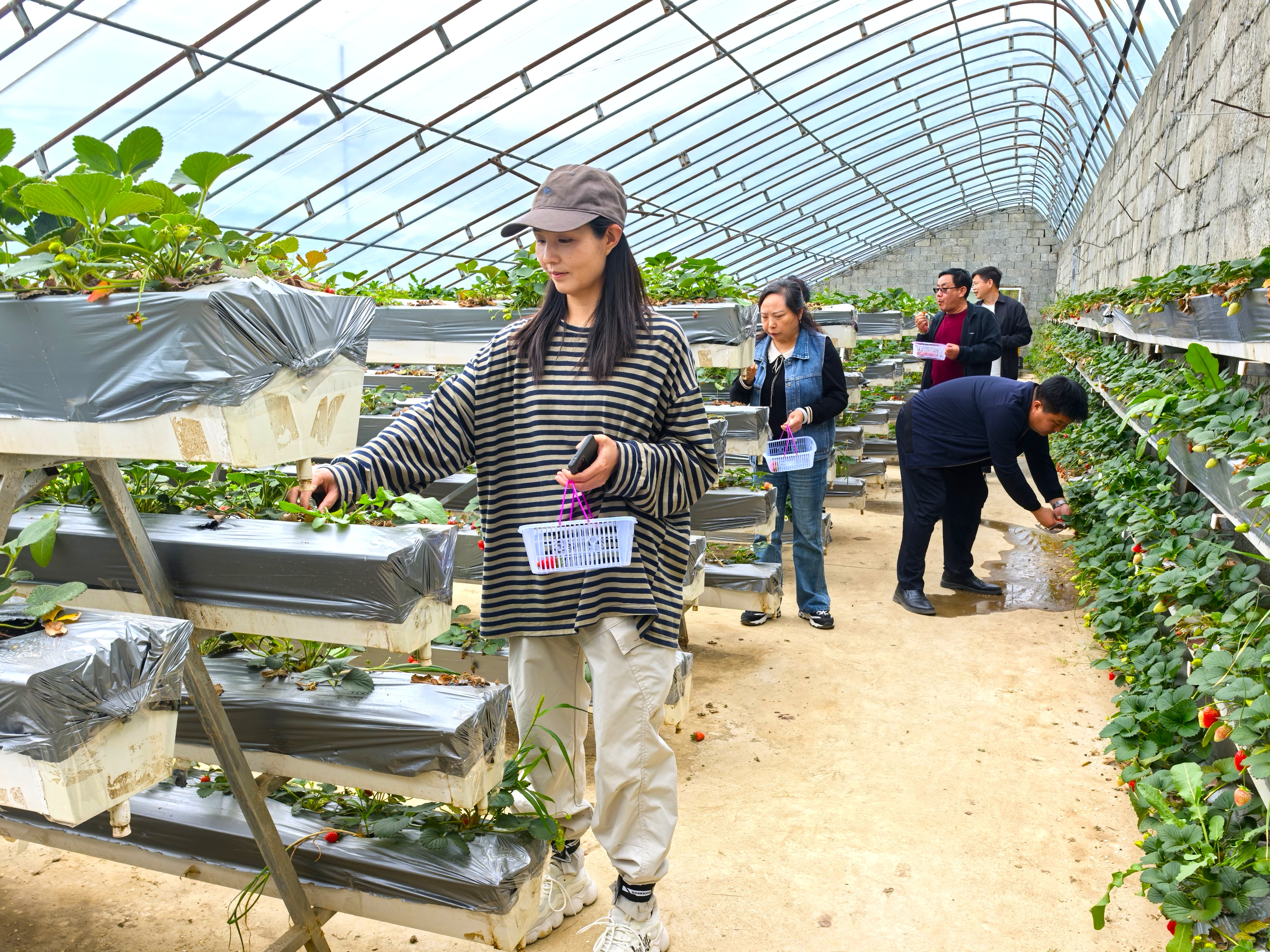 游客正在嵐皋縣眾達(dá)生態(tài)農(nóng)業(yè)科技有限公司的草莓園體驗(yàn)采摘樂趣。 張?zhí)毂?攝