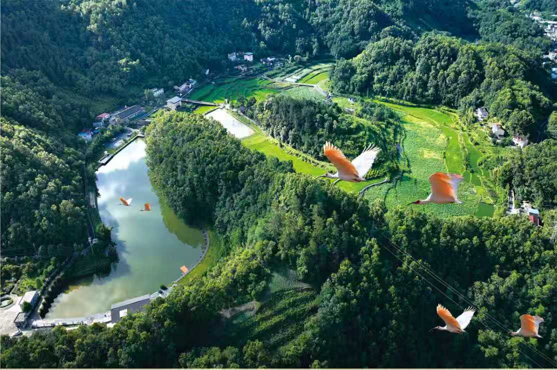 田野間,國(guó)家一級(jí)保護(hù)動(dòng)物朱鹮悠然棲息——或低頭覓食,或振翅掠過水面,與村莊、稻田構(gòu)成一幅和諧共生的畫面。