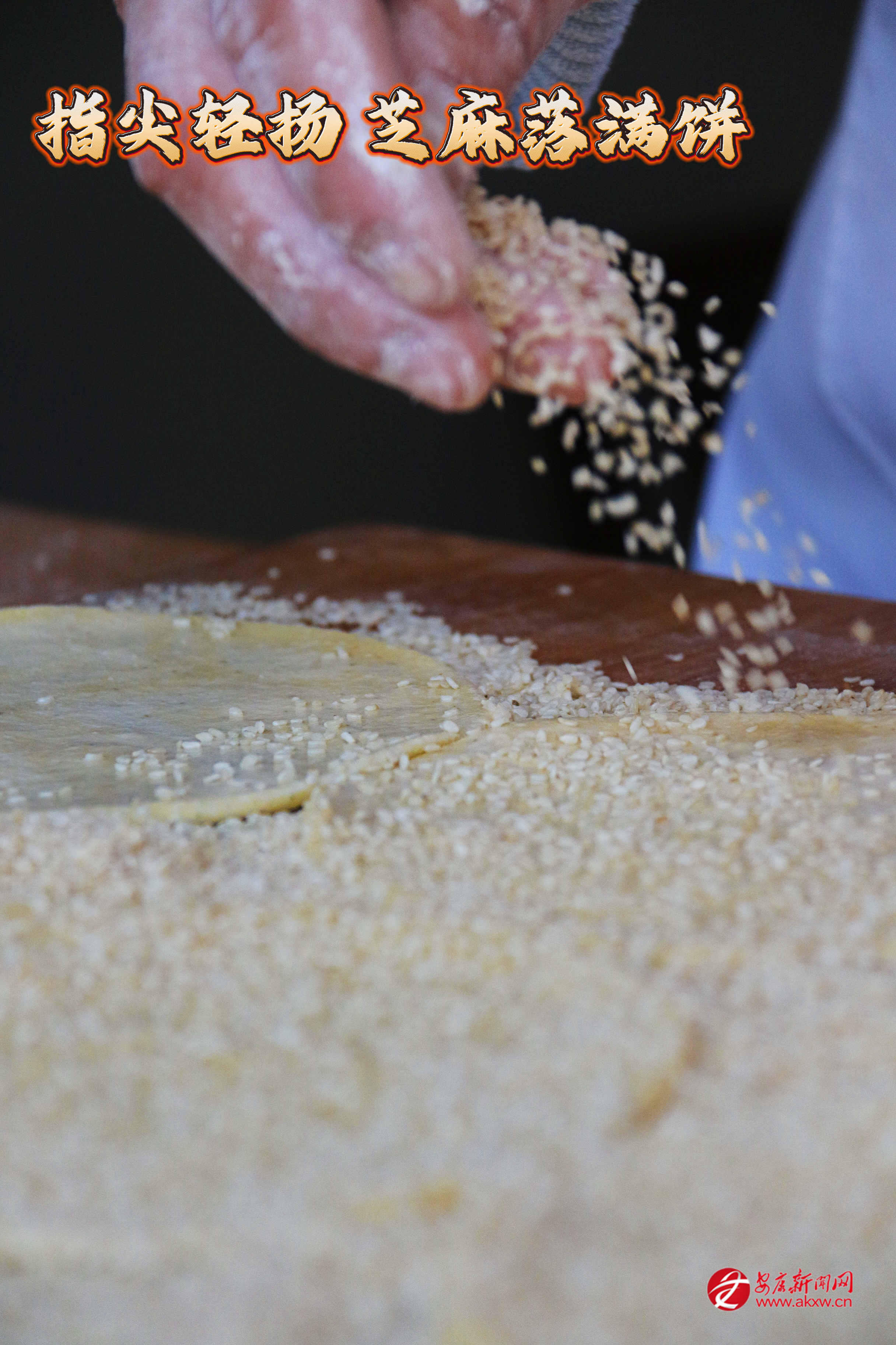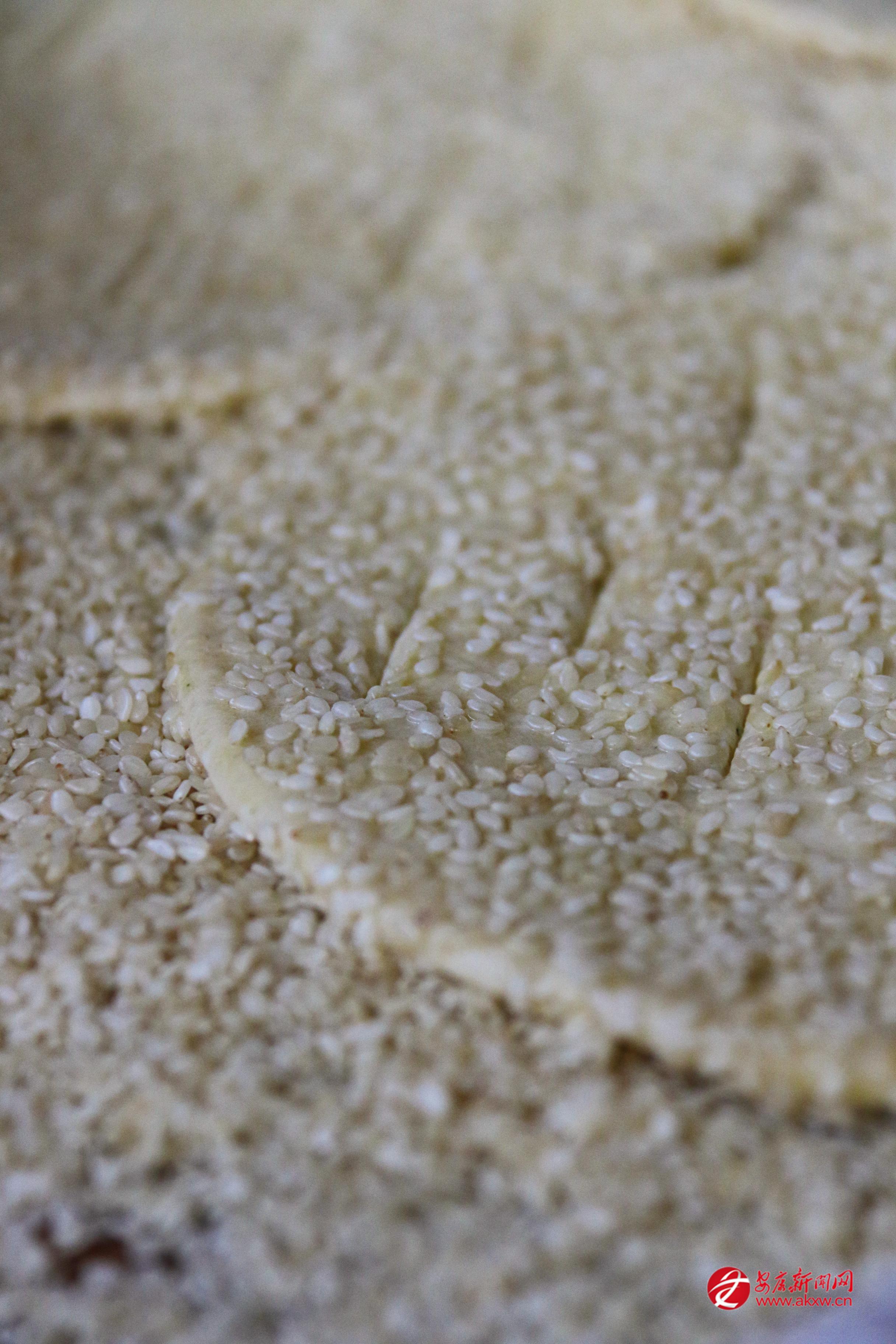 炕炕饃最講究的是“酥”。這酥不是靠油多硬炸出來的,而是用油酥一層一層疊進去的。做油酥得用豬油和菜油兩樣,再配上五香粉,小火炒得噴香。面團是老面發(fā)的,揉到光潤,再把油酥裹進去,搟開,折起,再搟開,反復(fù)好幾回。這時候的面已經(jīng)有了一層層薄薄的紋理,像書頁似的。搟好的餅坯中間薄、四周略厚,抹一層水,粘上白芝麻——可以只粘一面,叫“一面麻”;也可以兩面都粘,叫“二面麻”。然后放進一種特制的鐵鏊子里,上下都有炭火,夾著慢慢炕。中間還得翻一兩次身。