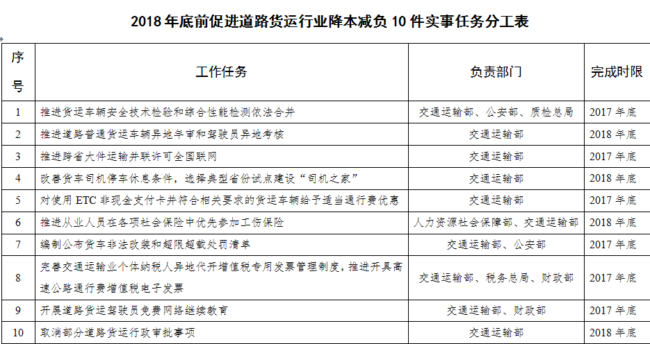 人民網(wǎng)北京9月20日電 據(jù)交通運(yùn)輸部網(wǎng)站消息,為促進(jìn)道路貨運(yùn)行業(yè)穩(wěn)定和諧、健康有序發(fā)展,交通運(yùn)輸部等十四個(gè)部門(mén)近日印發(fā)《促進(jìn)道路貨運(yùn)行業(yè)健康穩(wěn)定發(fā)展行動(dòng)計(jì)劃(2017-2020年)》,并附發(fā)了2018年底前促進(jìn)道路貨運(yùn)行業(yè)降本減負(fù)10件實(shí)事任務(wù)分工表。nsT安康新聞網(wǎng)
