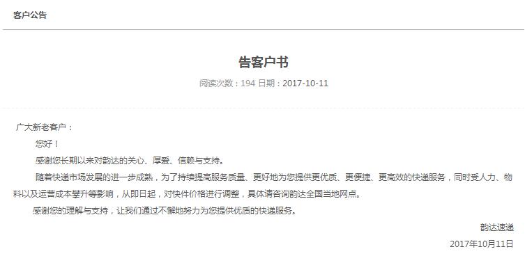 10月11日,韻達(dá)快遞官網(wǎng)發(fā)布《告客戶書》,表示為提供更優(yōu)質(zhì)、更便捷、更高效的快遞服務(wù),同時受人力、物料以及運營成本攀升等影響,從即日起,對快件價格進(jìn)行調(diào)整,具體請咨詢韻達(dá)全國當(dāng)?shù)鼐W(wǎng)點。rP4安康新聞網(wǎng)