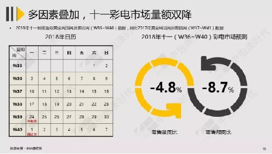 中怡康預(yù)測,今年十一彩電市場或呈現(xiàn)“量額雙降”局面,其中零售量同比下降4.8%,零售額則同比下降8.7%,長假對彩電行業(yè)所起的作用將小于預(yù)期。分析原因主要有兩點:一是每年促銷節(jié)點太多,消費者應(yīng)接不暇;二是新興營銷模式層出不窮,造成消費分流。