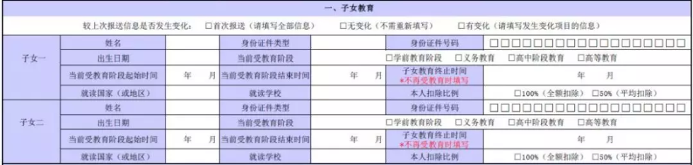 子女教育一欄中,除了子女姓名、身份證件類型及號(hào)碼等基礎(chǔ)信息填寫。值得注意的是,出生日期需填寫納稅人子女的出生日期,具體到年月日。而后面的“當(dāng)前受教育階段”,在“學(xué)前教育階段、義務(wù)教育、高中階段教育、高等教育”四種情形的對(duì)應(yīng)框內(nèi)打“√”。